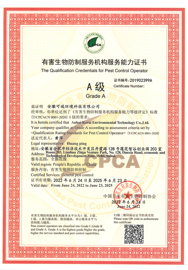 凱瑞蟲控是安徽可瑞環(huán)境科技有限公司旗下品牌,安徽可瑞環(huán)境科技有限公司成立于2014年,注冊資金500萬元,全國A級資質(zhì),致力于蟲害風險管理并提供蟲害消殺、防疫消毒、有害生物防制、蟲害控制管理與監(jiān)測、衛(wèi)生防疫消毒、商業(yè)清洗清潔服務、空氣治理服務、環(huán)境綠化施工與養(yǎng)護、藥品和器械銷售、技術咨詢與培訓等業(yè)務的服務性公司。公司是一家有行業(yè)資質(zhì)、注冊商標及專利的公司。我們不參與各種擾亂市場秩序的低價競爭,堅持以合理的價格、新穎的設備、優(yōu)質(zhì)的技術、完善的質(zhì)保體系和質(zhì)保措施,來對客戶進行綜合的服務工作。公司本著...